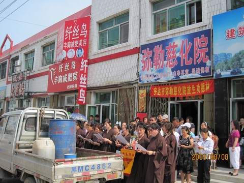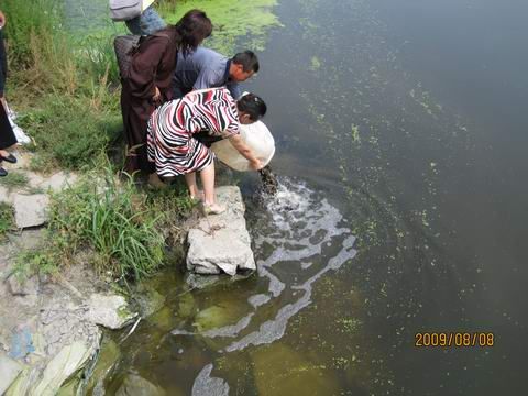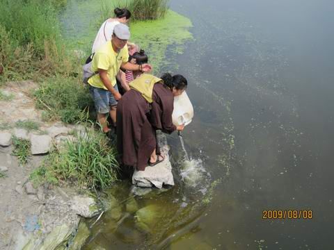 虽是初秋,北方迟来的酷热,仍是烈日炎炎。清晨,慈化院早早就聚集了很多前来参加放生的居士和信众,师兄们都按自己的分工紧张有序的忙碌着。上午九时,内众弟子和居士开始对面排班,虔诚恭敬,致心祈祷,唱诵《三宝赞》之后,列队在慈化院门前祈上师加持为放生物念诵放生仪轨。九时五十分,乘车去龙凤湿地保护区放生。放生过程两小时结束。