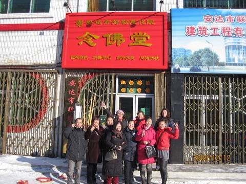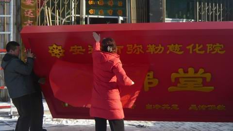 今天上午安达慈化院门前喜气洋洋,一片忙碌,经过慈化院众弟子的共同努力,在一片鞭炮声中。“安达慈化院念佛堂”的新牌匾高高悬起。红彤彤的牌匾在蓝天和白雪的映衬下,庄严又明亮。引来许多路人驻足赞叹。