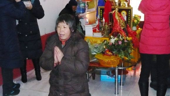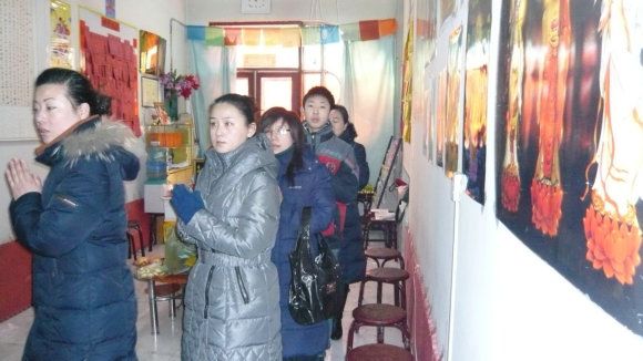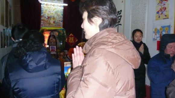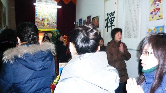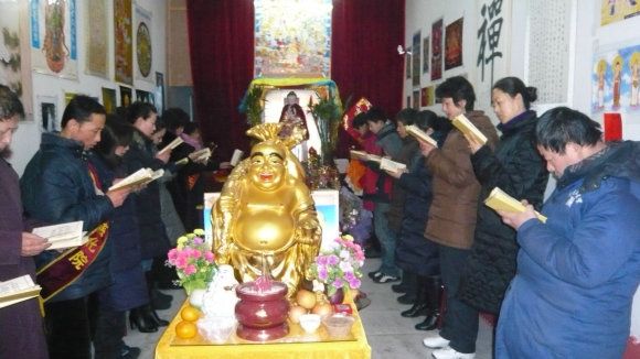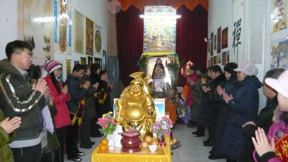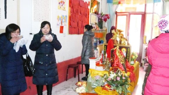 九点三十分,大众一起向上排班,面对上师境礼佛三拜,随唱香赞后,对班共修《释迦佛修法仪轨》,在一片“南无当来下生弥勒尊佛”的祈祷声中,礼请上师法照于供台,香花净水敬上。“腊八节”施粥活动正式开始。