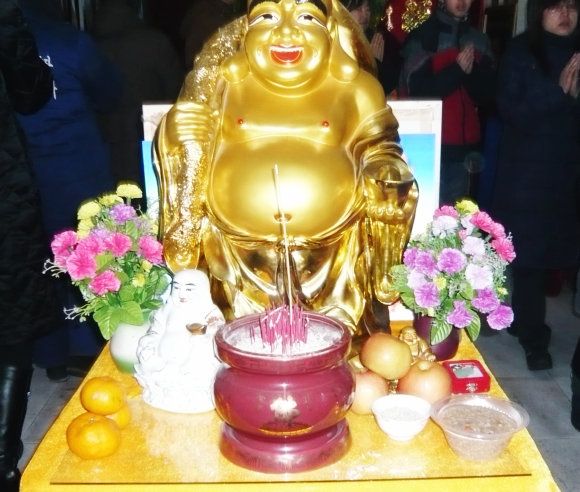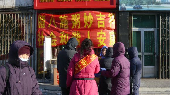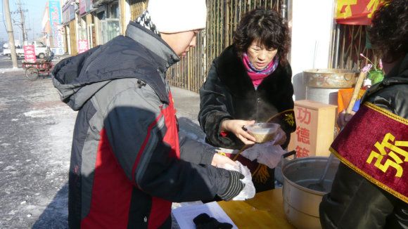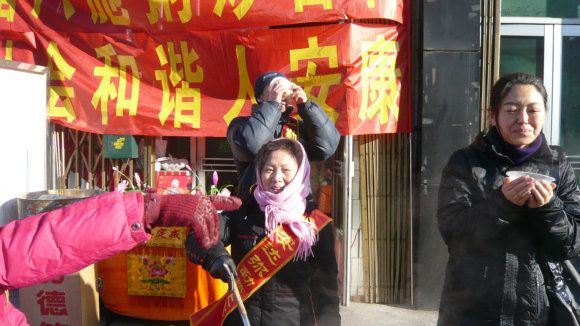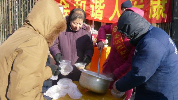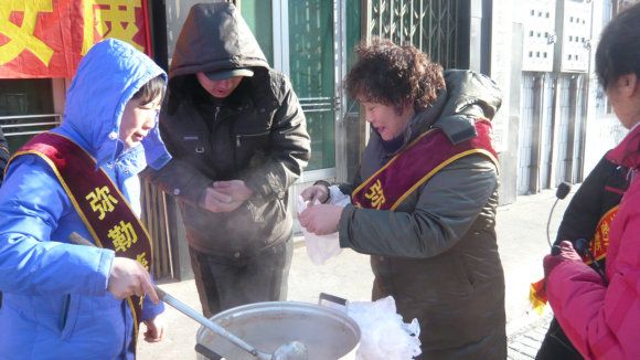 天气寒冷已在零下二十四度,慈化院门前热闹非凡,红红的模幅大大的标语,写着上师赐予的法语《腊八施粥妙吉祥 和谐社会人安康》,高音喇叭播放着上师简介和慈化院道场简况,不时伴着清欣的佛乐向人们介绍“腊八粥的来历”和“腊八节的传说”,师兄们身披寿带,喜气洋洋,热气腾腾的腊八粥引来众多路人和信众前来讨粥,寒风飘起腊八粥的香甜,暧意映着人们开心的笑脸,施粥的人每送一勺粥都会为他送上一份带有上师法语的宣传品,愿他因此得粥之因与上师三宝同结法缘,讨粥的人每双手都奉着上师三宝的慈悲,大家共同感恩上师三宝赐吉祥,祈愿人人映佛光。