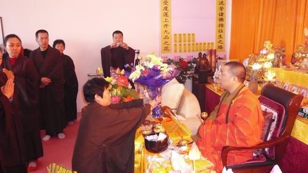 会禅师兄代表大众请法向楞严法师敬献鲜花