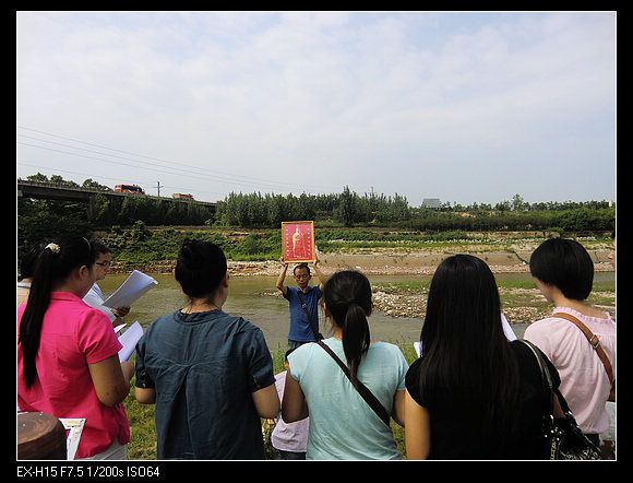 在放生现场,智刚师兄做仪轨,带领大家念诵仪轨文。智芳师兄顶奉上师法照,智晴师兄敲木鱼,智觉师兄打謦。在念诵完毕放生物命的时候,智悟师兄不小心把装有生命物的塑料袋划破了,约有几十条泥鳅滑落在距离河堤边很远处的石缝中,智晴、智刚两位随机带领大家一起捡捉滑落的泥鳅。随后大家边称念佛号边将这些物命放入河流中。