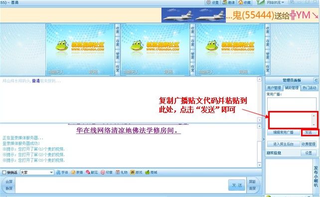 呱呱&论坛基础技术汇总贴 关于呱呱 一、如何进入呱呱 (1)@楞严一笑@ 22:21:40 ★注意★ 悲华在线的网络视频学习房间现在统一放在呱呱视频社区了,UC已停止使用。各位同修请尽快学会使用呱呱。近期将开展新一轮的网络学习。 呱呱视频房间和UC相似,象QQ一样需要先下载呱呱视频社区的软件在自己的电脑里安装或直接在线运行安装,注册申请一个呱呱ID号后输入密码登陆即可使用了。进入方式可任选一种以下的方式: http://chat.17guagua.net/enterroom.jspa?id=324655 点击呱呱游客地址进入 http://www.17guagua.com/download/classic_download.shtml 呱呱怀旧版下载安装 http://www.17guagua.com/ 呱呱首页右方下载进入 http://www.17guagua.com/download/index.shtml 呱呱聊天室下载进入 http://download.digi.tech.qq.com/soft/17/24/76205/index.shtml 呱呱软件腾讯下载进入 禅与人生房间的ID号是324655 ,位置是在聊天大厅里的个聊联盟-民族宗教-禅与人生,可搜索ID也可通过聊天大厅查找进入。 (2)下载安装呱呱的流程: 进入呱呱社区流程(含附件,点击即可下载) http://bbs.17guagua.com/viewthread.php?tid=18535 呱呱2010Betal版-新手入门-下载安装、注册 二、呱呱管理员技术 (1)http://bbs.17guagua.com/viewthread.php?tid=85892 呱呱怀旧版帮助指南(呱呱房间各项功能简介) (2)广播贴文 呱呱广播代码和UC类似,可通用。 管理员复制广播贴文代码至“管理员面板》辅助管理》常用广播”第二个框里,点击“发送”即可顺利发出广播贴文。 ![]() 附件为“呱呱常用广播贴文整理”文本,直接复制可用,点击可下载。(供参考) 内容包含以下五类: A.欢迎词劝助词系列: B.上师殊胜功德系列: C.法语甘露系列: D.经文链接系列: E.回向文: F.常用唱赞类广播贴文